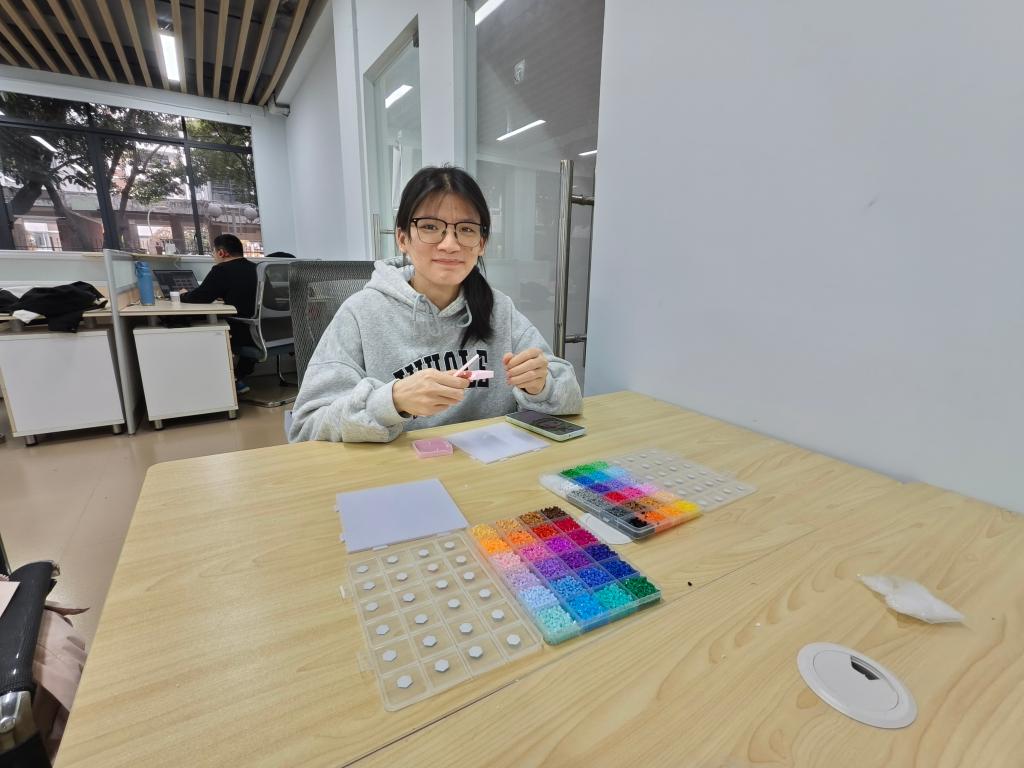 精心筹备,准备了色彩缤纷的拼豆、模板等物料,兼顾趣味性与实用性。现场氛围温馨,舒缓的音乐让同学们快速卸下疲惫,投入创作。活动伊始,工作人员讲解拼豆创作方法与熨烫技巧并示范,同学们随后自由创作,或独自专注,或结伴交流,将情绪与期许融入指尖动作,部分同学还结合专业特色,拼出化学元素、生物图案等创意作品。创作中,同学们远离纷扰,在专注中获得平静与愉悦。有同学表示,拼豆能让人集中注意力,看着零散豆粒拼成完整作品,既收获成就感,也缓解了焦虑。