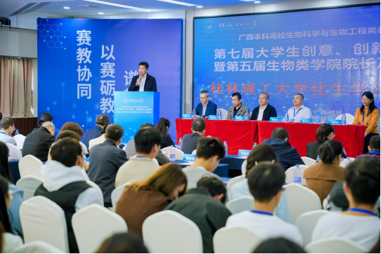 受学校党委副书记黎贞崇委托,彭代江代表学校向各位领导嘉宾、各参赛队伍表示热烈欢迎,并介绍了我校在化学及相关学科建设方面的进展。李有志代表广西本科高校生物科学与生物工程类教学指导委员会讲话,勉励参赛同学以赛促学,学研互动,以研兴学,展现新时代化生学子的专业风采。